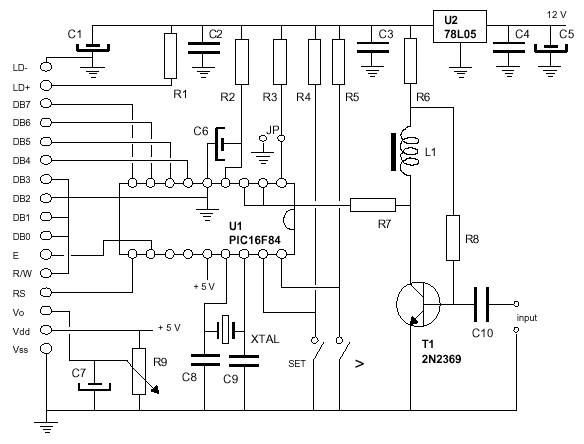 Toda a informação apresentada nesta página está contida em ficheiro PDF feito pelo autor. Lá encontra toda a informação que necessita para efectuar a montagem. De qualquer forma aqui ficam o esquema, lista de componentes, implantação dos componentes, placa de circuito impresso e o software.